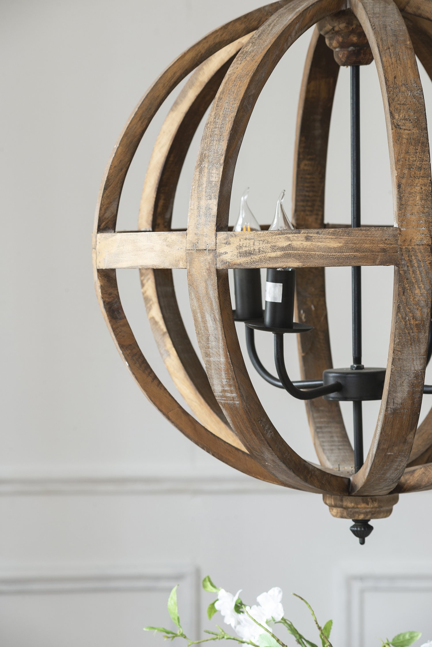 The Pratt Sphere Four-Light Chandelier adds a warm, inviting look to any space with its globe design, rich wood, and contrasting black iron fixture. With its simple style, the Pratt Chandelier enhances a variety of styles with its appealing, versatile look. Hang in a farmhouse kitchen, eclectically-decorated living room, lofty foyer, or above a modern dining table, .